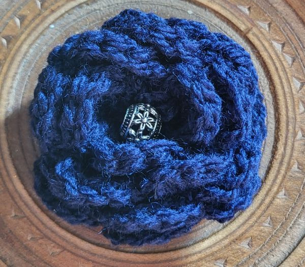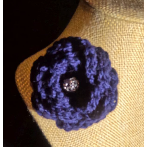 This pretty navy blue flower brooch has been crocheted using acrylic yarn. It is embellished by a pretty metal bead in the flower centre.
