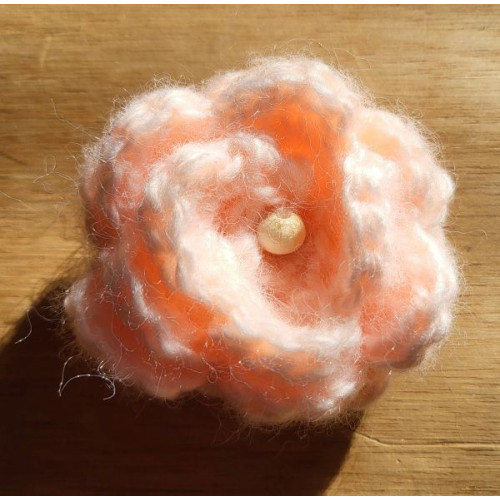 This pretty peach flower brooch has been crocheted using acrylic yarn. It is embellished by a pretty wooden bead in the flower centre.