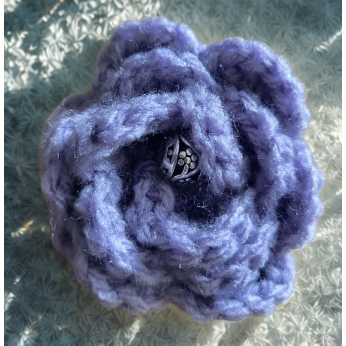 This lovely flower brooch has been crocheted using lilac acrylic yarn. It is embellished by a pretty silver bead in the flower centre.