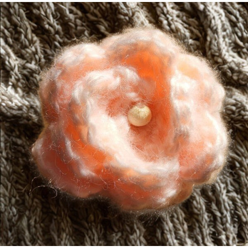This pretty peach flower brooch has been crocheted using acrylic yarn. It is embellished by a pretty wooden bead in the flower centre.