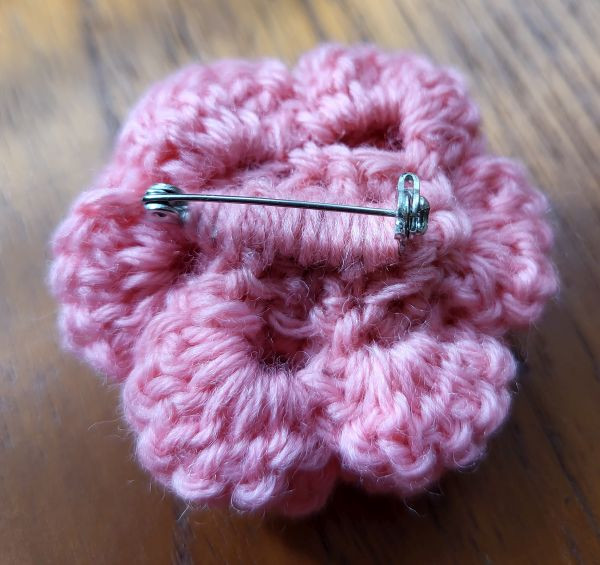 This lovely flower brooch has been crocheted using pink acrylic yarn. It is embellished by a pretty wooden bead in the flower centre.