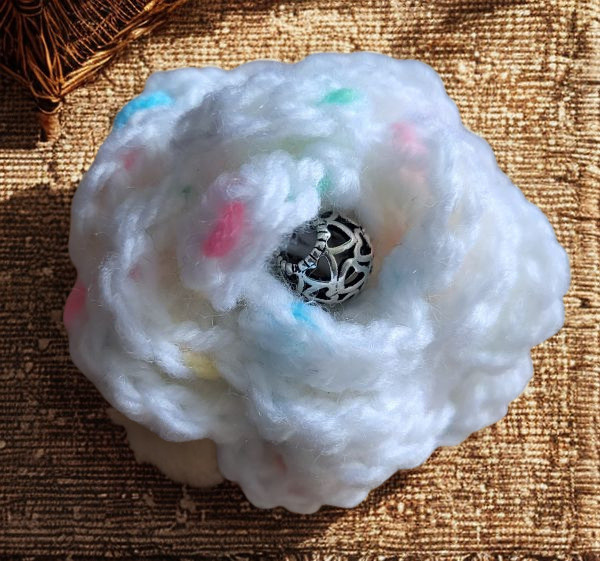 This lovely flower brooch has been crocheted using white with coloured flecks acrylic yarn. It is embellished by a pretty silver bead in the flower centre.