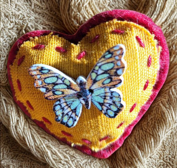This heart shaped brooch embellishment is perfect for dressing up an outfit, hat, scarf or bag. It has been handcrafted using red felt and yellow fabric with a butterfly-shaped button. It fastens with a brooch pin sewn onto the back.