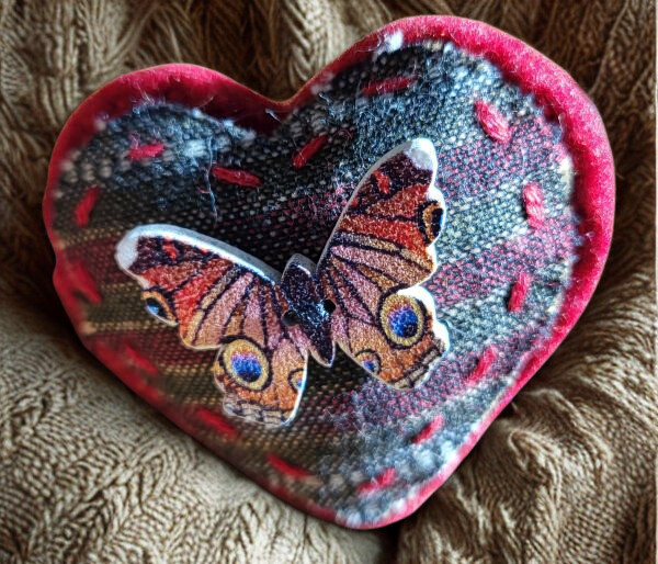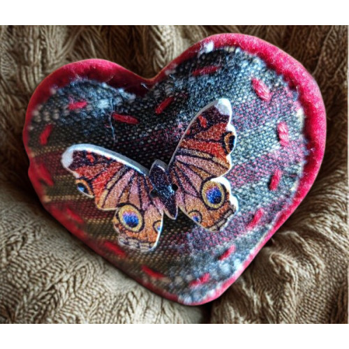 This heart shaped brooch embellishment is perfect for dressing up an outfit, hat, scarf or bag. It has been handcrafted using dark red felt and daark striped fabric with a butterfly-shaped button. It fastens with a brooch pin sewn onto the back.