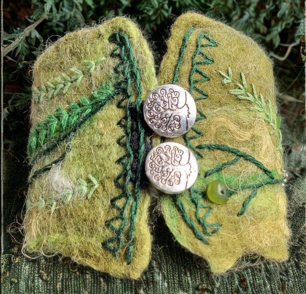 This wristband has been created by wet felting wool into a rectangular wrap-around. It fastens with 2 metal buttons with a tree design attaching to elastic loops. It is decorated with hand embroidery, metal charm embellishments and nephrite jade crystals.