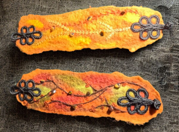 This pair of wristbands have been created by wet felting orange and yellow with a hint of brown wool fleece into 2 rectangular wrap-arounds. They fasten with black frog fasteners. They are decorated with hand embroidery and tigers eye crystal chips.