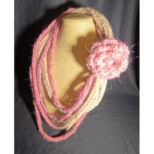It is woven using a lucet tool and then embellished with a crocheted flower brooch. The brooch is detachable so you can switch it up with your style, depending on your mood or to colour coordinate with your outfit. Additional brooches can be found in the brooches section of this website, or you can feel free to add your own. You can also wear it without any brooch attached if that works best for you.