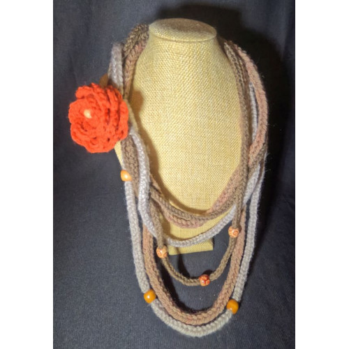 It is woven using a lucet tool and then embellished with a crocheted flower brooch. The brooch is detachable so you can switch it up with your style, depending on your mood or to colour coordinate with your outfit. Additional brooches can be found in the brooches section of this website, or you can feel free to add your own. You can also wear it without any brooch attached if that works best for you.