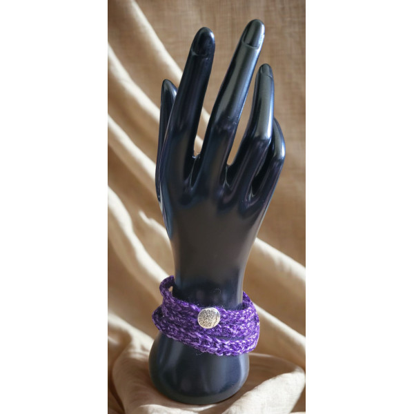 This wrist band has been created using the Traditional Crochet method to form a long band that wraps around the wrist. It fastens with a decorative metal button with an embossed tree design that goes through a buttonhole.