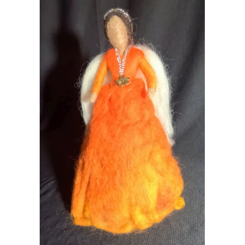 It has been crafted entirely by hand, needle felting soft multi-tone orange and yellow Merino wool onto a core wool base that has been needle felted onto a metal armature. This wire structure allows for the Angel to be posable as desired.