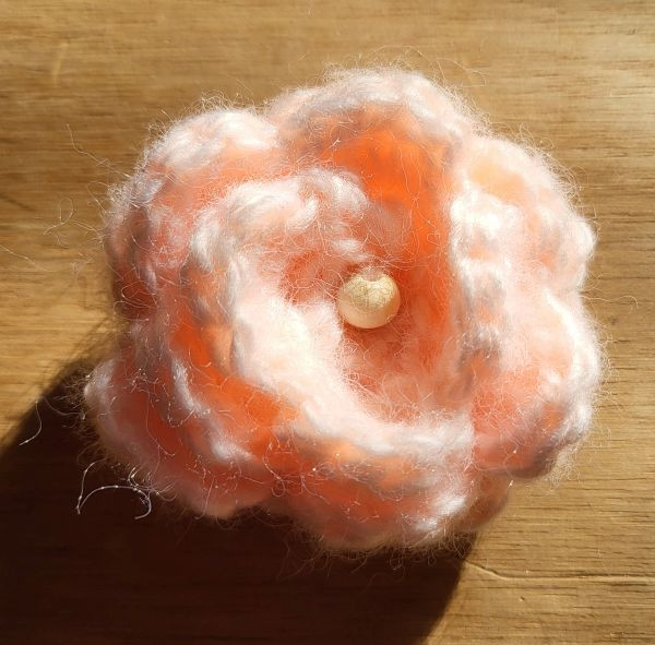 This pretty peach flower brooch has been crocheted using acrylic yarn. It is embellished by a pretty wooden bead in the flower centre.