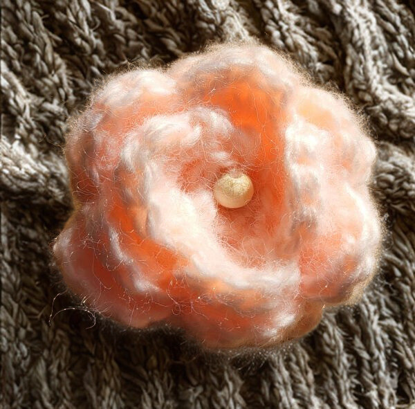 This pretty peach flower brooch has been crocheted using acrylic yarn. It is embellished by a pretty wooden bead in the flower centre.