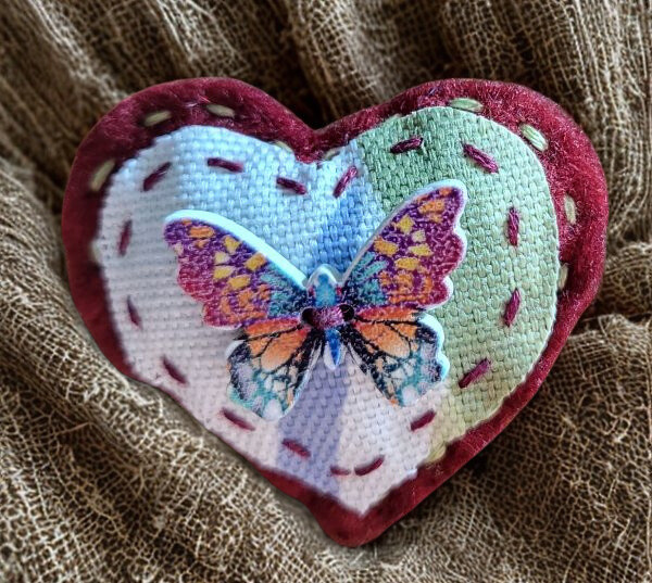 This heart shaped brooch embellishment is perfect for dressing up an outfit, hat, scarf or bag. It has been handcrafted using dark red felt and floral fabric with a butterfly-shaped button. It fastens with a brooch pin sewn onto the back.