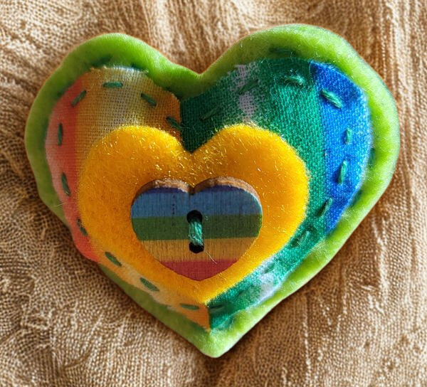 This heart shaped brooch embellishment is perfect for dressing up an outfit, hat, scarf or bag. It has been handcrafted using lime green felt, yellow felt and rainbow fabric with a heart-shaped rainbow button. It fastens with a brooch pin sewn onto the back.