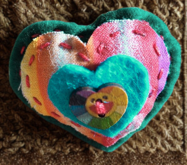 This heart shaped brooch embellishment is perfect for dressing up an outfit, hat, scarf or bag. It has been handcrafted using emerald green felt, blue felt and rainbow fabric with a heart-shaped button. It fastens with a brooch pin sewn onto the back.