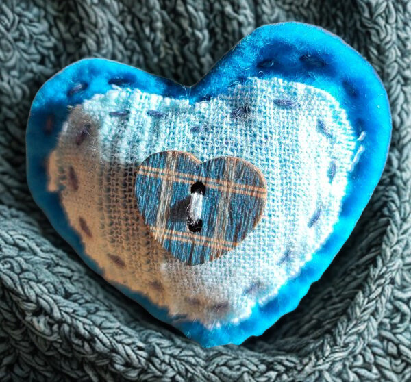 This heart shaped brooch embellishment is perfect for dressing up an outfit, hat, scarf or bag. It has been handcrafted using bright blue felt and blue patterned fabric with a heart-shaped button. It fastens with a brooch pin sewn onto the back.