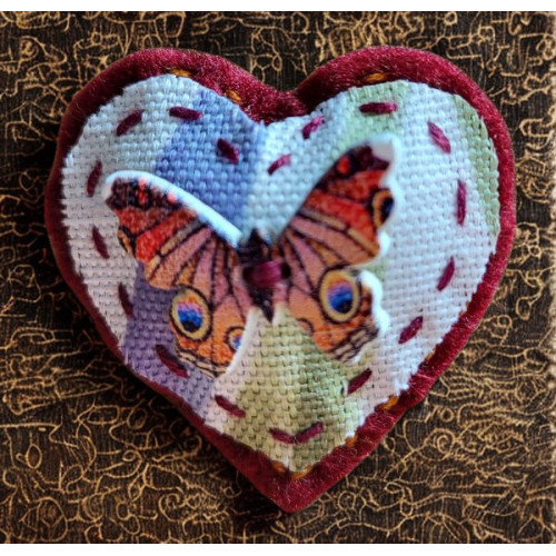 This heart shaped brooch embellishment is perfect for dressing up an outfit, hat, scarf or bag. It has been handcrafted using red felt and floral fabric with a butterfly-shaped button. It fastens with a brooch pin sewn onto the back.