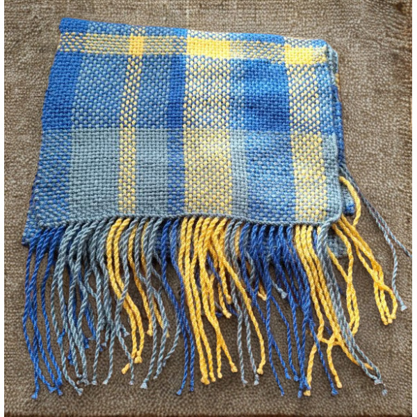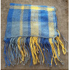 This scarf has been woven on a rigid heddle loom using yellow, blue and pale sage colour double knitting yarn that has been produced from recycled plastic.