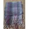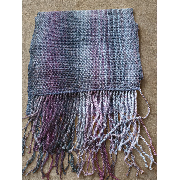 This scarf has been woven on a rigid heddle loom using acrylic double knitting yarn. The colour of this scarf is varying shades of purple.