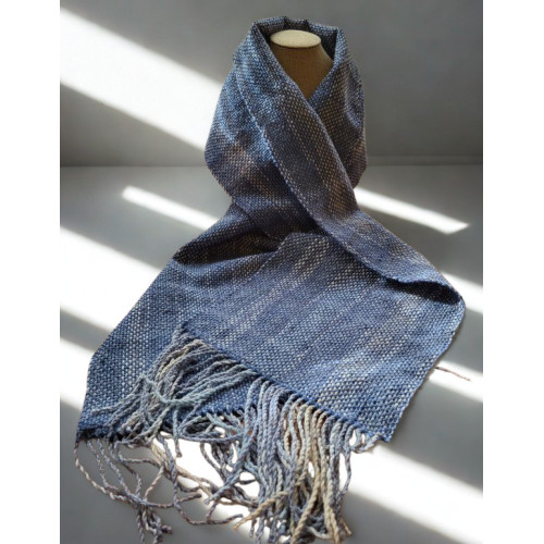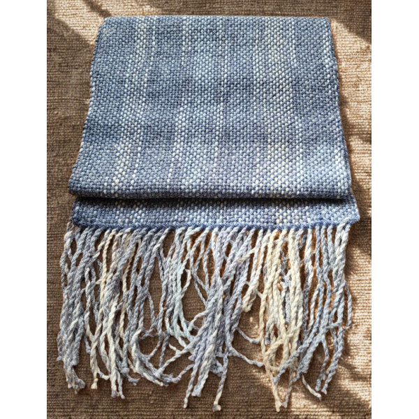 This scarf has been woven on a rigid heddle loom using acrylic double knitting yarn in a denim shade of blue with cream accents throughout.