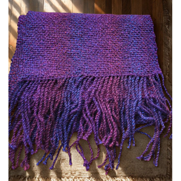 This scarf has been woven on a rigid heddle loom using acrylic double knitting yarn. The colour of this scarf is shades of purple and burgundy.