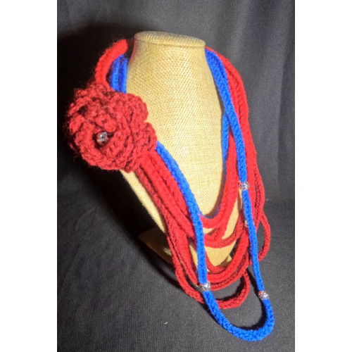 It is woven using a lucet tool and then embellished with a crocheted flower brooch. The brooch is detachable so you can switch it up with your style, depending on your mood or to colour coordinate with your outfit. Additional brooches can be found in the brooches section of this website, or you can feel free to add your own. You can also wear it without any brooch attached if that works best for you.