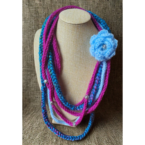 It is woven using a lucet tool and then embellished with a crocheted flower brooch. The brooch is detachable so you can switch it up with your style, depending on your mood or to colour coordinate with your outfit. Additional brooches can be found in the brooches section of this website, or you can feel free to add your own. You can also wear it without any brooch attached if that works best for you.