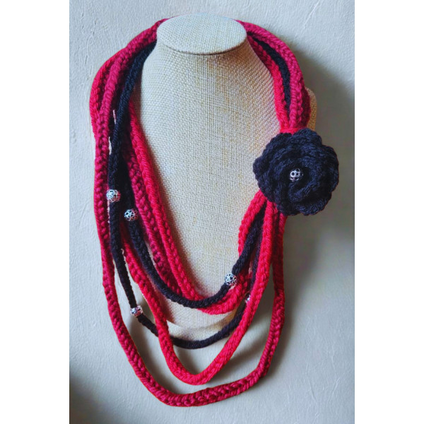It is woven using a lucet tool and then embellished with a crocheted flower brooch. The brooch is detachable so you can switch it up with your style, depending on your mood or to colour coordinate with your outfit. Additional brooches can be found in the brooches section of this website, or you can feel free to add your own. You can also wear it without any brooch attached if that works best for you.