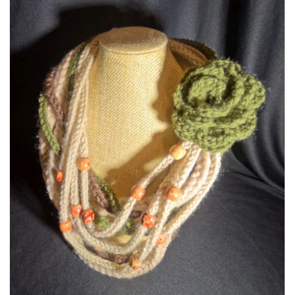 It is woven using a lucet tool and then embellished with a crocheted flower brooch. The brooch is detachable so you can switch it up with your style, depending on your mood or to colour coordinate with your outfit. Additional brooches can be found in the brooches section of this website, or you can feel free to add your own. You can also wear it without any brooch attached if that works best for you.
