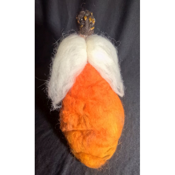 It has been crafted entirely by hand, needle felting soft multi-tone orange and yellow Merino wool onto a core wool base that has been needle felted onto a metal armature. This wire structure allows for the Angel to be posable as desired.