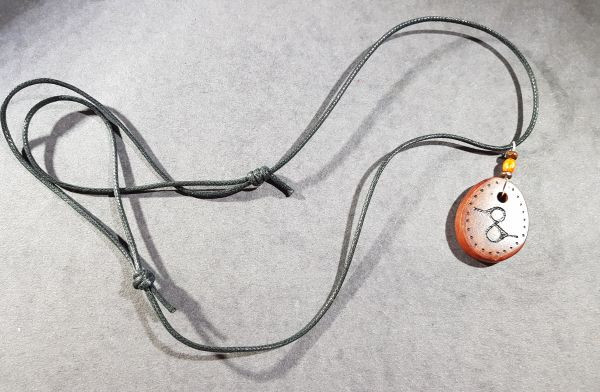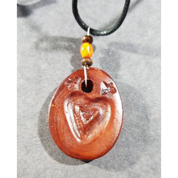 The wooden carved piece is attached to a long thong by wire and is finished with 3 small wooden beads. The thong is adjustable to allow the necklace to be placed over the head easily and then shortened to the desired length.